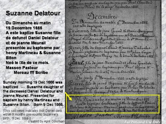 | The Children of Daniel DeLaTour and Jeanne Meurail Daniel Delatour, born 4 Feb 1657 Jean Delatour, born 15 August 1658 Jeanne Delatour, born 13 January 1660 Isaac Delatour, born 2 Sep 1663 *Suzanne Delatour, born 9 Dec 1666 [this is our Suzanne Latour] |