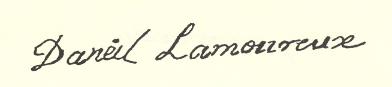 | The signature of Daniel Lamoureux as a witness to the baptism of his son, Daniel. |